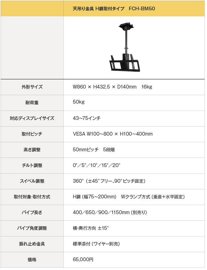 「省施工・高信頼」天吊りディスプレイ設置ソリューション:FCH-BM50