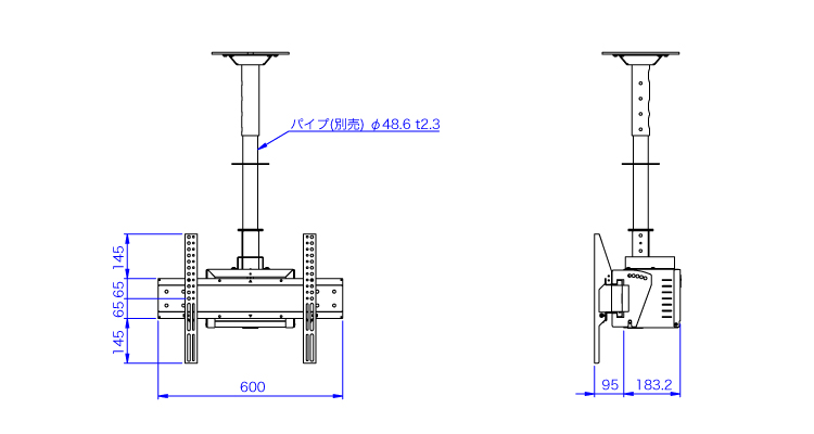 43〜55インチまでのディスプレイを搭載できる天吊り金具です。