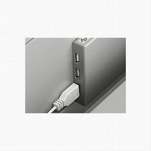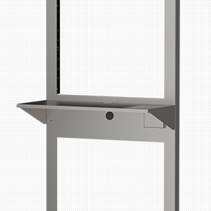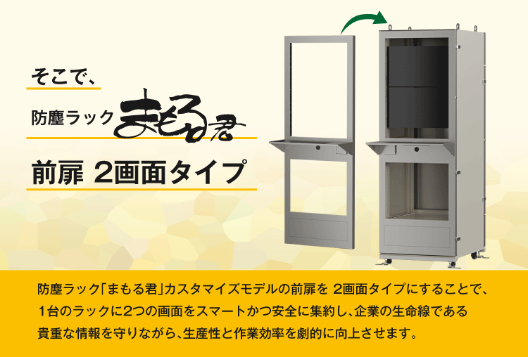 専用設計オプションの「2画面タイプ前扉」と「ディスプレイユニット」を使用することで、ラック内に上下2画面のスマートな設置が可能です。これにより、作業者の視線移動は最小限に抑えられ、情報確認とデータ入力の効率が飛躍的に向上します。