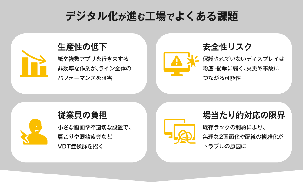 IoTやAIの導入が加速する現代の製造現場。生産性の向上、ペーパーレス化、そして熟練技術者のノウハウ継承のために、「工場のDX(デジタル・トランスフォーメーション)」は、もはや避けては通れない経営課題です。 そのDX化の第一歩として、多くの工場で複数の情報を同時に表示・操作できる2画面(デュアルディスプレイ)環境の導入が進んでいます。しかし、その過程で新たな課題に直面していないでしょうか? |