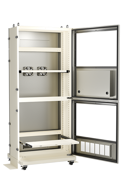 5μm以上の粉塵を補足する除塵フィルターを介し、排気ファンによって強制的にラック内の熱を排熱します。比較的粉塵の少ない現場に適しています。