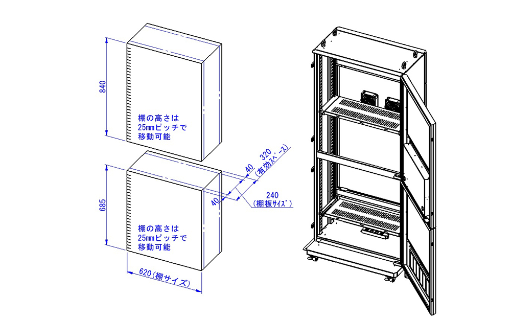 収納機器許容発熱量は、周囲温度30℃、動作温度35℃、搭載機器稼働率70%とした際の机上計算値です。