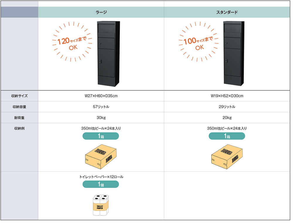 宅配ボックスは、日常使いに十分な収納力を備えています。スタンダードタイプは、取扱量の多い荷物のサイズに対応しています。ラージタイプは、飲料や日用品なども受け取れる余裕のある収納容量を確保しています。